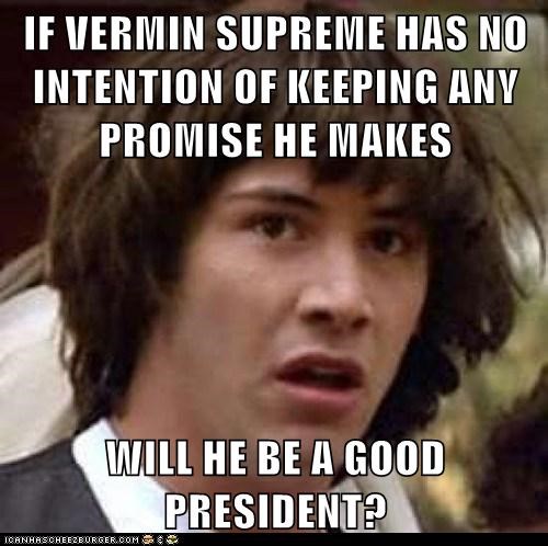 Vermin supreme meme. Vermin love supreme is an american performance artist politician and activist who has run as a candidate in various local state and national elections in the united states. Rasta vermin 3 4 sleeve tee 23 00 25 00. Off topic posts will be deleted with extreme prejudice. Paid for by pony up for vermin supreme. Showing all 5 results. Truly an angel sent from heaven to save us all jk lmao. His origins are mysterious and his given name is a closely guarded secret.
